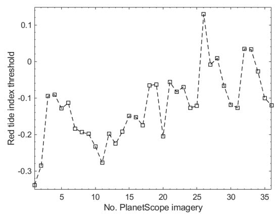 RTI thresholds of 36 PlanetScope images. The threshold was determined by the median RTI value of the red tide pixel group in each image.