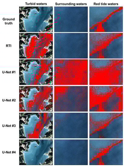 Ground-truth and red tide maps generated by RTI and four U-Net models in the three water types of turbid, surrounding, and red tide waters from a PlanetScope image acquired on 29 July 2018 at 01:42 GMT near the coast of Goheung. Red tide pixel was marked in red.
