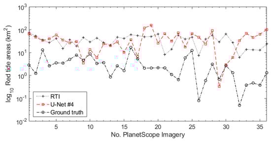 We compared the quantitative performances of RTI and U-Net #4 for the 36 PlanetScope images in Table 6. We evaluated FOMs for three different areas of red tide occurrence: low extent (LE), middle extent (ME), and high extent (HE) groups. LE indicates red tide areas <5 km2, ME refers to areas of 5–10 km2, and HE refers to an area of more than 10 km2. For the performance of the RTI and U-Net #4, the accuracy was similar in each group. However, compared with the RTI, the FOMs of U-Net #4 were improved. The sensitivity of U-Net #4 in the LE and HE groups increased by 22% and 32%, respectively. The precision of U-Net #4 in LE, ME, and HE increased by 33%, 78%, and 40%, respectively. The F-measure of U-Net #4 in the ME and HE groups increased by 57% and 35%, respectively. Figure 9 shows the red tide areas extracted from the RTI, U-Net #4, and ground-truth maps of 36 PlanetScope images. The red tide areas extracted from the RTI and U-Net #4 were wider than those in the ground-truth areas. We compared the difference between the ground truth areas and red tide areas extracted using the RTI and U-Net #4. As a result, red tide maps extracted by RTI did not differ by less than 5 km2 from the ground-truth area, while red tide maps derived from U-Net #4 differed by less than 5 km2, accounting for 19% of the 36 images. The differences in the red tide areas between the RTI and U-Net #4 with the ground truth were similar in the LE and HE groups. However, for the ML group, U-net #4 (10.31 km2) differed significantly less than in RTI (24.23 km2).