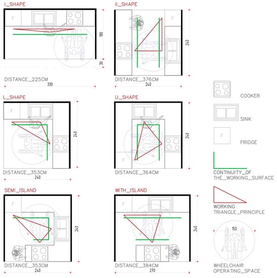Six typical types of the kitchen are shown in Figure 1. These kitchens are further analyzed in terms of user movement inside the kitchen and use of the cooker as the primary considered element in this research. The II_SHAPE form of kitchen, and kitchens with an island, have discontinuities of countertop and significantly larger distances between kitchen elements. I_SHAPE and L_SHAPE have a logical position of elements over short distances, which can easily support any user regardless of the physical capabilities. These two shapes also provide a good overview of all subsequent elements in the kitchen (front or side view and access, without needing to rotate 180 degrees as in the U-SHAPE, kitchen with semi-island, and kitchen with island). Therefore, the organization of the cooking process becomes easier. In this way, the user is stimulated to do several related actions during the cooking process simultaneously. According to the previous discussion, it was concluded that the I_SHAPE and L_SHAPE of kitchen are the most suitable, both in terms of distance and continuity of countertop. Additionally, the I_SHAPE and L_SHAPE of kitchen are most suitable for people in wheelchairs, since there is enough space for daily food preparation activities.