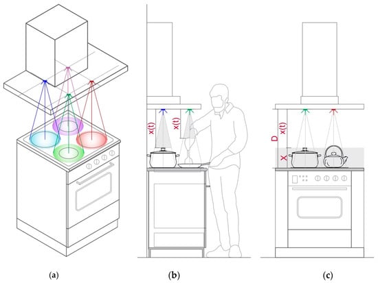 Illustration of the sensing system and corresponding distance measurement parameters; (a) axonometric view with the position of sensors, as well as relation between cooking area and hood; (b) side view; (c) front view.