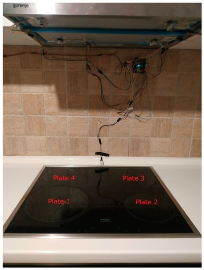 Information about whether the cooker, or any individual plate, is switched on or off can be obtained using a Hall sensor, which can detect current flow. If the power consumption of each burner is known, and if it is different for each burner’s circuit, it is possible to determine exactly which circuits are active []. A design of a circuit for contactless and precise AC-current sensing using a Hall sensor is given in []. We will consider this information as the plate state. The plate state is denoted as p, and could have two values: