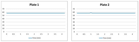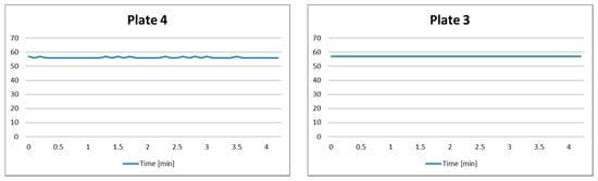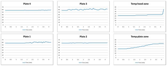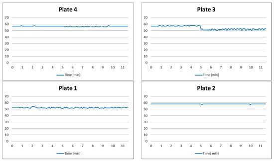 The measurement results for the distance and temperature are given in Figure 7. In the beginning of the experiment, all plates are turned off. One may notice that Plate 3 is turned on after half of a minute from the beginning of the experiment. After 2.5 min from the beginning of the experiment, Plate 1 is turned on. After turning on both Plate 3 and Plate 1, one can notice some smaller variations of measured distances for Plate 2 and Plate 4. This is a consequence of temperature variations. Specifically, the temperature at the plate zone increases much faster than temperature at the hood zone, which is normal for the relatively small duration of the experiment. Therefore, the temperature compensation for Plate 2 and Plate 4 was not performed ideally.