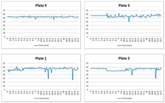 The measured distances for each plate are shown in Figure 9. Characteristic photo samples of the performed cooking process and results of the corresponding decision-making for each plate are given in Table 8. During the first 4.5 min, Plate 1 is turned on and there is pot on it, while Plate 4 is turned off with a pot on it (distance value x = 53 is detected). Plates 2 and 3 are turned off and empty during this period (measured distance about 57 cm). Please note that small variations within readings for Plate 2 and Plate 4 are a consequence of temperature changes on the Plate 1. After that, the pot is removed from Plate 1 (distance higher than 57 cm due to increased temperature of the still-hot plate) and moved to Plate 3 that is turned on. Additionally, there is a pot detected on Plate 2 that remains turned off. Between 12.5 and 13 min from the beginning of the experiment, a user interaction with the cooking process is detected, first above Plate 1, and later above Plates 2 and 3. After that, the cooking process continues with the following statuses: Plate 1, Plate 2, and Plate 4 are turned off and empty, while Plate 3 is turned on with pot on it. Another interaction with the cooking process is detected at 20.7 min from the beginning of the experiment above Plate 1, when obviously some pot is placed on it. Movement is also detected above Plate 2 and the pot is not present on Plate 3 anymore (measured distances between 57 and 60 cm). At the end of the cooking process, there are pots detected on each plate.