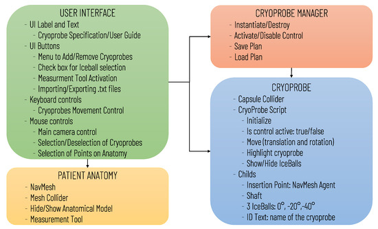 The software application, designed for a desktop computer (with Microsoft Windows 10 Operating System, 64-bit), integrates multiple modules/scripts to: visualize, explore, and measure the patient-specific 3D anatomical structures; and to simulate cryoprobe insertions to optimally plan their ideal number and proper placement according to the tumour location/extension. The application was developed on the cross-platform game engine Unity3D (Unity Technologies Inc., San Francisco, CA 94103, USA) (version 2019.3.15f1).