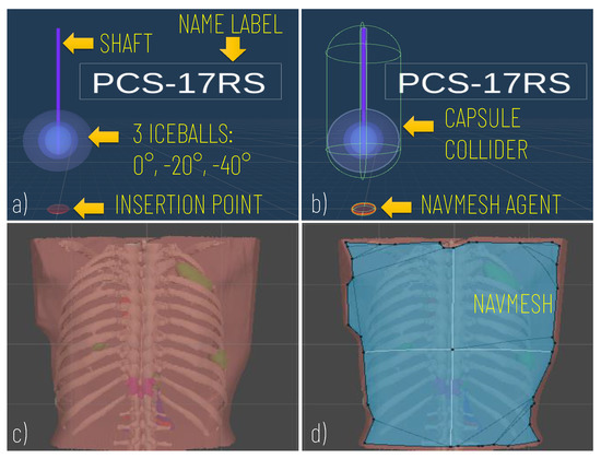 Modelling of the Cryoprobe and the anatomy. (a) A cryoprobe prefab comprising the model of the needle, three isotherm ice balls, the insertion point, and a label for the model’s name; (b) Unity components added to the cryoprobe prefabs: capsule collider to allow the cryoprobe selection via mouse click; (c) Example of the anatomical model imported; (d) The navigation mesh (in blue) baked on the torso of the patient and used to implement the interactive navigation of the insertion point on the skin).