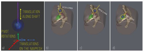 Simulation of the cryoprobe placement. (a) 5 DOF modelled for defining the best insertion point (2 DOF translations for displacement on the skin model), insertion axis (2 pivot rotations), and insertion depth (1 DOF translation). (b–d) Example of sequences of simulator scenes after pivot rotation (c) and translation (d) along the cryoprobe longitudinal axis.