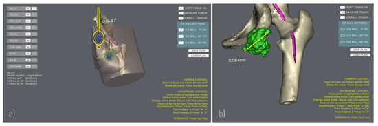 GUI during a planning. (a) Planning the positioning of two Cryoprobe. The “active” Cryoprobe is highlighted in yellow; (b) Example of measurement performed to evaluate the size of a tumour.