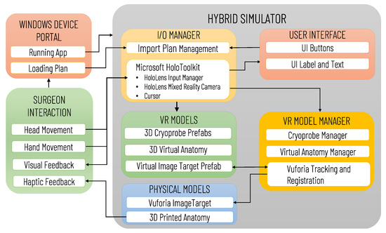 Figure 6 illustrates the architecture of the Mixed Reality Simulation Environment, highlighting the data transfers between software and hardware modules (e.g., 3D printed Anatomy and Vuforia Image Target), and the possible user interactions. The software modules comprise an I/O Manager, the User interface, VR Models and the VR Model Manager. The I/O Manager is based on the use of MRTK to handle the HoloLens mixed reality functionalities, allowing the user an intuitive interaction with the virtual content, and the importing of the preoperative plan via the Windows Device Portal (WDP). WDP is a web server that enables communication with the HoloLens Headset via the network connection, the management of the HoloLens apps, and the navigation/loading of files. The surgeon can load/reload the preoperative plan at any time, and can visualize in AR the last planned configuration/positioning of the cryoprobe models by clicking a UI button.