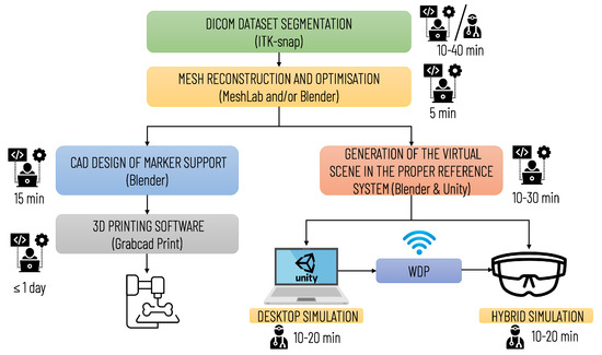 Diagram illustrating the operational steps for implementing the entire simulation and planning platform. The preparation of the simulation requires qualified technical personnel; the segmentation phase can be performed by medical personnel (by a radiologist or the surgeon himself/herself) or by technical personnel. In the latter case, the final approval of a radiologist is required.
