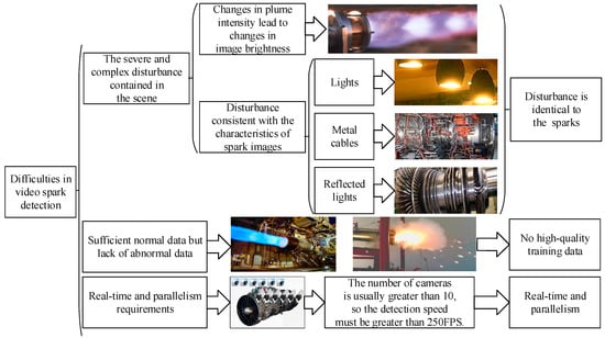 Figure 1 shows the three difficulties faced by intelligent spark detection. First, the feature of a single spark is a bright line segment, which is completely consistent with the features of the lights, metal cables, and reflected light in the image. Second, a lack of abnormal spark data hinders the training of supervised learning models. Third, more than 10 cameras are used to monitor the status of aero engines, which requires the spark detection algorithm to be real-time and parallel.