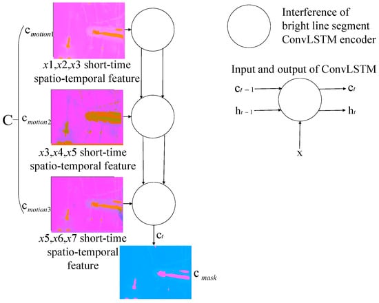 where is the cell state predicted by ConvLSTM in the last step, which is the encoding results of three motion feature images and includes features of long-time existing interference. is the output predicted by ConvLSTM in the last step. represents a new image sequence composed of three motion feature images.