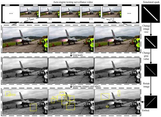 Generating the simulation data set using this method allowed for high-efficiency and rewarding deep learning model training. Figure 11 shows a schematic diagram of generating the simulated aero engine anomalous spark data set. In the next part, our experiments on the open-source anomalous spark data set show that a spark detection model with high precision and robustness can be trained using the data set generated by our proposed simulated spark generation method. The flow chart of generating the training data is shown in Figure 12.