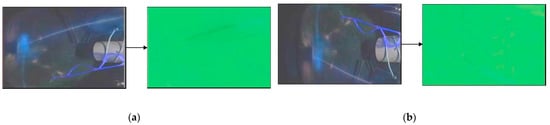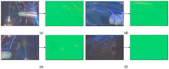 (a–c) present the encoding visualization results, generated from input image sequences with various anomalous sparks by the ConvLSTM-based motion-sensing encoder and ConvLSTM-based interference encoder. The visualization method scales each value of the three-channel two-dimensional tensors, output by the activation function, in the interval from 0 to 255, and displays it as an RGB image.