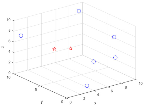 We have used MATLAB R2020a to perform all simulations using the computer with Intel(R) Core(TM) i5-8600 CPU @ 3.10 GHz. All simulations parameters are set as follows. To generate the measurements, we used Equations (2) and (3). The number of Monte Carlo runs () is set to 50,000. The reference distance () is set to 1 m. The true TP () is set to −10 dBm. The true PLE () is set to 2.2 for all anchor nodes. All targets and anchor nodes are randomly located inside a box with an edge length m. Figure 3 is a deployment example of targets and anchor nodes that are randomly generated under and .