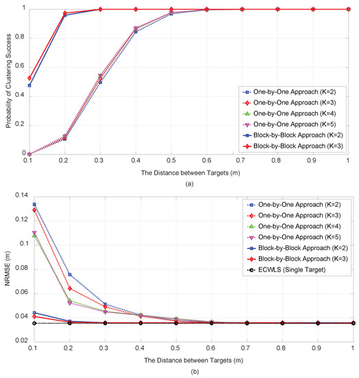 Figure 6 illustrates the resolution performance of the proposed algorithm for a high SNR scenario based on plots of the PCS (a) and NRMSE (b) for various distance between the targets. Two targets (), in which the center was in the origin, were considered, and the distance between the two targets was set from 10 cm to 1 m. The initial target number K was set from 2 to 5 for the one-by-one approach and for the block-by-block approach. The noise variances were set to mild RSS (dB) and small angle variance (deg). At this noise level, the single-target estimation algorithm (EC-WLS) yielded an RMSE of approximately 0.036 when the measurement sets were identified correctly. The PCS by the block-by-block approach outperformed that by one-by-one approach by up to 0.6 m. It is noteworthy that for this high SNR setting, the initial target number indicated almost similar PCS performance.