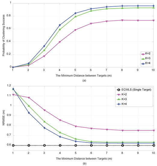Figure 8 shows the performance of the proposed algorithm for four targets () for a low SNR scenario. For , the block-by-block approach becomes impractical because of the exponentially increased complexity; therefore, only the one-by-one approach was considered. The targets were in the vertices of a cube centered at the origin, and the minimum distance among the targets increased from 1 to 10 m. The number of initial anchor nodes was set to and 4 for (dB) and (deg). For this low SNR and four-target situation, the PCS deteriorated substantially, but a reasonable NRMSE was obtained for .
