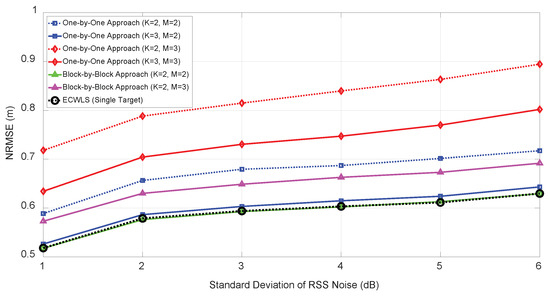 Figure 9 shows the NRMSE performance of the proposed algorithm for the number of targets and initial anchor nodes for the one-by-one approach, and initial anchor nodes for block-by-block approach under various RSS noise () from 1 to 6 dB. The angle noise level was set to (deg) with anchor nodes. In this setting, for , one-by-one approach with and block-by-block approach with demonstrated similar NRMSE performance, which approached the single-target localization performance.