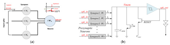 The choice of neural network on chip for this work is SNN, regarded as the third-generation neural network, due to its biological feats and efficiency in the spatial–temporal signal coding [28]. In SNN, a web is weaved by the interconnections of neurons and synapses to perform inference and training tasks. Contrary to the continuous behavior of ANN, SNN works by making use of discrete events called spikes, which appear at specific time intervals. The occurrence of a spike event (0/1) mirrors the biological-chemical process of information delivery between different neurons. The neuron (post-synaptic) in a layer receives an input spike train from another neuron (pre-synaptic) in the previous layer, which are interconnected through synapses. The Figure 1a demonstrates a simple model of an SNN with a neuron, connected to a multitude of input synapses that receive input spike trains from pre-synaptic neurons. These input spike trains are modulated according to the respective synaptic strength (weight) and converted into current. The proportionate charge from all the synapses is then accumulated on the neuronal membrane as membrane potential. When membrane potential accumulates up to a predefined threshold value then the neuron emits or fires an output spike [29]. Thus, neurons act as an accumulation and comparison processing unit, while synapses are formed as memory with a communication interface.
