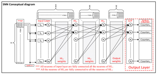 Figure 2 illustrates the overall block diagram for the proposed SNN hardware whose architecture is optimized using the BSRC-based SNN model. The SNN under study comprises four fully connected layers constituting synapses, neurons, and flipflops for weight and image memories. In order to minimize the chip size, our BSRC SNN optimization method reduced the input image size to 9 × 9 pixels from 28 × 28 pixels of the MNIST dataset. This proved to be the smallest size that could satisfy our target goal for accuracy of 94% or higher. The Input layer has 81 neurons for utilizing the 9 × 9 grayscale images as an input to the SNN. Our BSRC SNN optimization also determined the structure of each layer as follows: The output layer consists of 10 neurons for classifying the image, while two hidden layers consist of 30 and 20 neurons. All the neurons in each layer are fully connected with one another via 3311 synapses. After many iterations of the BSRC SNN optimization process, an SNN of four layers, namely (81-30-20-10), is determined, which consists of an input layer of 81 nodes, 1st hidden layer of 30 nodes, 2nd hidden layer of 20 nodes, and an output layer of 10 nodes.