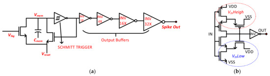 The LIF-based neuron circuit design is explained in Figure 3a. The neuronal membrane is simply modeled by a capacitor Cmem, which integrates the synaptic currents in order to generate Vmem across it. Cmem is realized by the Metal–Insulator–Metal Capacitor (MIMCAP) to achieve better linearity along with less power consumption. The leakage path of the neuronal membrane is modeled by a resistor that is implemented via partially-on NMOS transistor to save the area. The decision of a neuron to fire an output spike is performed by a comparator for which we have implemented a Schmitt Trigger circuit as shown in Figure 3b. The Schmitt Trigger compares the Vmem with the predefined threshold voltages. When the Vmem exceeds the threshold voltage, the Schmitt Trigger fires an output spike, and the feedback path resets the membrane potential to the initial resting potential (Vreset) via a separate NMOS transistor. As an important part of a neuron circuit, it needs careful designing in order to achieve optimum threshold voltages to ensure high speed and low power operations. Traditional neuron circuits often employ digital comparators requiring a global clock, which are power hungry as compared to asynchronous circuits. Analog asynchronous circuit implementations can achieve higher energy efficiency [43]. Therefore, the choice of asynchronous Schmitt Trigger for our neuron circuit provides a significant advantage by consuming less power and providing higher speed. Moreover, its simpler circuit implementation leads to small chip size, while its high sensitivity results in a highly accurate performance. The output buffers are implemented to provide the reshaping of the output spike pulses and isolation from the synapse circuits of the next layer.