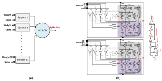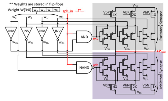 - Asghar, M.S.; Arslan, S.; Kim, H. Low Power Spiking Neural Network Circuit with Compact Synapse and Neuron Cells. In Proceedings of the 2020 International SoC Design Conference, Yeosu, Korea, 21–24 October 2020; pp. 157–158. [Google Scholar] [CrossRef]