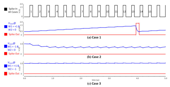 Figure 7 shows the circuit simulation result for the hidden layer circuit given by Figure 6b. In the top graph of Figure 7, the spike-in signal of the current layer is the output spike signal from the previous layer. Although individual synapses receive their spike-in signals from different neurons’ outputs of the previous layer, in the simulation of Figure 7, for simplicity, the same spike-in signal is applied to the two synapses of Figure 6b. The synapses connected to a neuron in the hidden layer can have either positive or a negative weight value. The simulation verifies in three cases with two synapses connected to a neuron having a different combination of weight values. The first case in Figure 7a is when one synapse has a weight value W1 = +1, and the other has a weight value W2 = 0. This case demonstrates an excitatory behavior, where the neuron fires an output spike after receiving a sequence of input spikes. The second case illustrated in Figure 7b is when one synapse has W1 = −1 and the other has W2 = 0. It demonstrates an inhibitory behavior, where the neuron does not fire any output spike. The third case is depicted in Figure 7c, which shows the case when one synapse has W1 = +1 and the other has W2 = −1 weight value. Here the excitatory synapse injects the charge on Vmem, while the inhibitory synapse discharges the Vmem at the same amount. Therefore, Vmem remains at resting potential Vreset resulting in no output spiking activity. The simulation elucidates the biological neural behavior by the proposed circuit implementation of LIF model. The important simulation parameters along with neuron and synapse area and power estimation are summarized in Table 1.