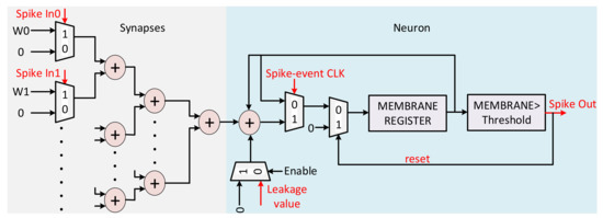 The input layer converts each input pixel value to a sequence of spikes using a design implementation of the integrate and fire (without leakage) neuron logic. The input layer converts 81 pixel values using 81 synapses in a way similar to the analog SNN implementation presented in Section 3.1. Figure 8 shows the detailed block diagram of a hidden layer implementation. Each neuron logic in the SNN has a membrane potential storage register and has a number of synapses attached as inputs. The neurons and synapses operate at discrete events represented by the rising edge of the spike-event clock. The spike-event clock is generated by dividing the system clock by an adjustable factor, which is set to 3 for the measurements results provided in Section 4.2. Each synapse, upon receiving a spike, adds its weight value to the membrane register. Whenever, the membrane potential exceeds the threshold value, the neuron generates an output spike and reset its membrane register value. The spikes are generated and received at the spike-event clock, while the width of each spike is equal to the system clock period.