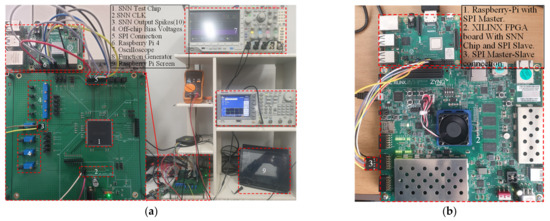 Figure 10a shows a test printed circuit board (PCB) for testing the analog SNN chip and the measurement setup. A host CPU board (Raspberry Pi in our test setup) was used to download weight data and configuration parameters, and then provide input image to the SNN chip via a Serial Peripheral Interface (SPI). The on-chip digital controller activates the input layer to take pixel values from the image memory and convert them to input spike signals for SNN. Once all the spike signals are propagated through each layer, the output layer counts the final output spikes, while the digital controller sends back the data to the host CPU board for an evaluation of the classification results. Figure 10b shows the measurement setup for the fully digital implementation, which is described in Section 4.2.