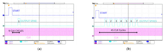 The measured results are shown in Figure 11. The spike propagation phenomenon is achieved successfully, as observed in circuit simulations. Figure 11a is the case when one input spike applied at the first neuron cell propagates through the first neuron cell of all the layers. This propagation is achieved by having maximum weight (7 in our implementation) for the first synapse of the first neuron in every layer, while all other weight values are set to zero. With one input spike applied to the first layer and the maximum weight value in every layer, the output layer generates one output spike. Similarly, in Figure 11b, 7 input spikes are applied to the first layer and propagated by using the same weight configuration as of Figure 11a. The measured results of Figure 11 verify the biological propagation of spikes from one layer to another layer for the SNN chip under test. The MNIST data set was applied during testing and the average on-chip current was measured for different applied images. The measured average current was 592 μW, which gives the power consumption of the test chip as 1.06 mW, while operating at a 10 MHz clock signal.