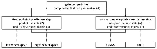 Figure 1 gives an overview of how the sensor measurements are introduced to the Kalman filter. The left and right wheel speeds are used in the time update, where the state and its covariance matrix are predicted to the next epoch (see Formulas (2) and (3)). The preprocessed GNSS and IMU observations are used in the measurement update to correct the state and its covariance matrix (see Formulas (6) and (7)).