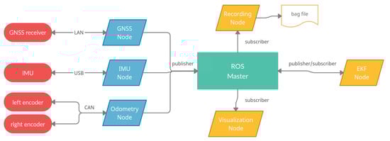 All software development has been done in C++ using the ROS framework to be able to communicate with sensors and compute a solution in real-time. One of the advantages using ROS is that the sensor hardware can easily be decoupled from the overall program flow which is illustrated in Figure 3. Each sensor node (blue) acquires data by utilizing the sensor specific hardware interfaces (red). This data is afterwards packaged in a ROS message and transmitted to the ROS master using a publish-subscribe pattern. All subscribers in ROS (yellow) have callbacks for specific messages, for example a GNSS fix message. Therefore, the implementation of a data-driven Extended Kalman Filter (EKF) is easy to achieve because the update step in the filter is only executed when data is transmitted from a sensor node. Another advantage is that multiple nodes can subscribe to the same topic and process it at the same time. Thus it is possible to compute a solution, visualize current data, and record this data at the same time. Data recording is another advantage because by recording data into so-called bag files, it is possible to replay these files later and simulate a real-time environment. By utilizing callbacks for gaining sensor information, GNSS outages can easily be simulated by disabling the GNSS message publisher.