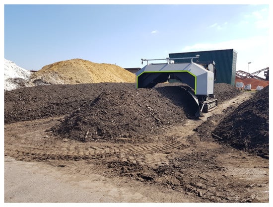 The tracked compost turner used for the field tests was the eWender E35eco by Pusch & Schinnerl GmbH. In contrast to conventional compost turners, which are usually diesel-driven, the eWender is electrically driven [26] and can be steered remotely. Figure 5 shows a picture of the eWender driving through the windrows during the field tests.