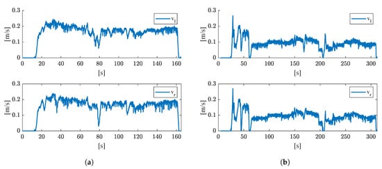 To obtain the left and right track speeds which are used to propagate the vehicles’ state, the radial velocities measured by the rotary encoders are converted to track speeds with Formula (1). Figure 8 shows the left () and right () track speeds for both test runs. The left and right track speeds within the same test run hardly differ from each other, as the vehicle drove along a straight path in both test runs. When the speeds of the first (a) and second (b) test run are compared, it is noticeable that the vehicle drove faster during the first test run (approximately 0.2 [m/s]) than in the second (approximately 0.1 [m/s]).