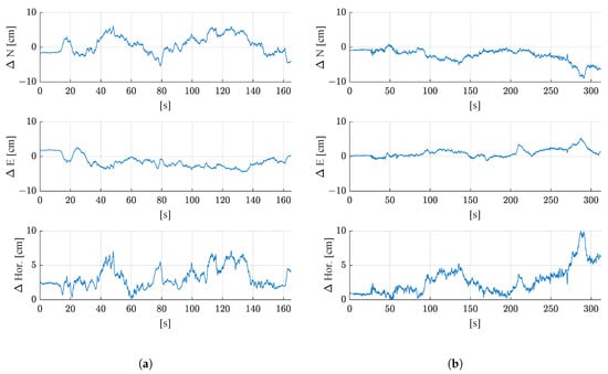 Deviation from the reference trajectory in north (), east (), and 2D horizontal deviation () for (a) the first test run, and (b) the second test run.