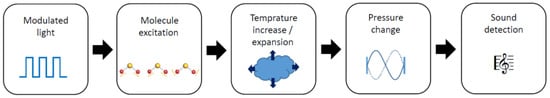 The PA signal is mainly generated by the colliding molecules, which cause a temperature increase (Figure 1) that results from the conversion of absorbed light energy to translational energy [5]. Assuming the ideal gas law, an increase in the gas temperature results an increase of the gas pressure. The modulation of a light source changes the gas temperature frequently, giving rise to a periodical pressure change (Figure 1) within a defined volume (typically a photoacoustic cell) [25]. The frequent pressure change within the photoacoustic cell can be considered as a sound signal that can be converted into an electric signal via an acoustic transducer [5].