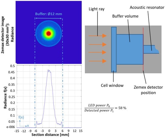 The ray-tracing simulation results with ZEMAX conducted at the entrance of the resonator (see simulation detector position in right schematic image). The focused beam diameter is clearly smaller than the buffer diameter (12 mm) and reaches a minimum diameter of around 2.8 mm before entering the photoacoustic resonator.