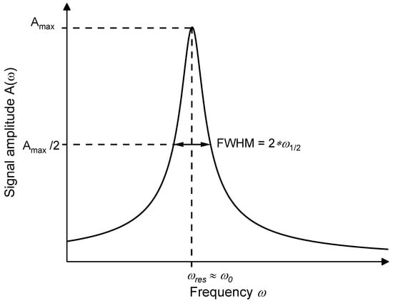 The external raw data analysis of the sensor signal is carried out using a Python script that identifies and determines the amplitude as well as the resonance frequency of every measured signal curve. The behavior of the photoacoustic resonance curve can be described as a forced oscillation (Figure 4), whose amplitude was described by Robert Wichard Pohl as the following Equation (1) [29]: