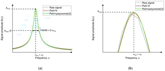 The three remaining parameters—the amplitude , the damping coefficient and the frequency —in Equation (5) can all be specified as starting values for the fit that describes the amplitude’s height, width and position within the frequency domain, which is essential for fusing the data analysis with the evaluation electronics.