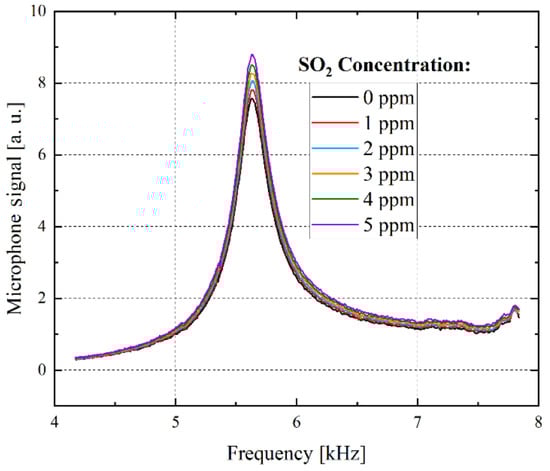 Sensor response during exposure to SO2. The SO2 concentration was varied from 0 to 5 ppm in 1 ppm steps. A resolution of one ppm is achieved. The microphone signal peak height increases with increasing SO2 concentrations [16].