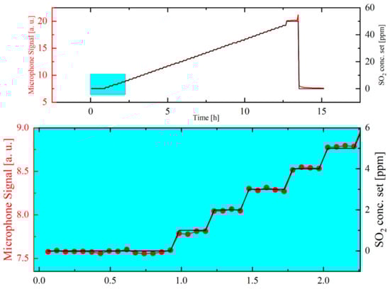 The microphone signal (red curve) in relation to the set SO2 concentration (black curve), which is varied between 0 and 50 ppm using pre-calibrated mass flow controllers. Upper graph: The detected microphone signal in relation to the set SO2 concentrations over a period of 15 h. Lower graph: zoom graph of the microphone signal at the first five concentration variations resembling the set SO2 concentrations 0 up to 5 ppm.