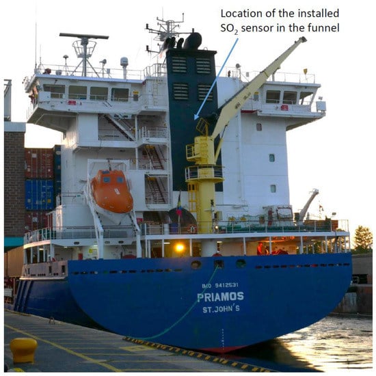 The developed combustion monitoring system, which is shown in Figure 3, was integrated into the container ship PRIAMOS (Figure 8) that mainly operates within the North and Baltic Sea. PRIAMOS (IMO: 9412531) is a container ship (Cargo: Hazard A (Major)) that was built in 2011, which has an overall length of 157.71 m, is 23.54 m wide and shows a current draught of about 8.5 m. The container ship PRIAMOS sails under the flag of Antigua Barbuda and features a carrying capacity of 880 TEU (20 ft equivalent units). It only uses low sulphur fuel (maximum SO2 concentration about 109 ppm SO2) and subsequently does not require an additional EGCS to reach the allowed maximum emission values.