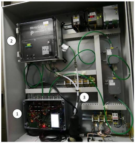 However, the emitted gas of a funnel with an EGCS shows typical temperatures around 50 °C, while the temperature of the emitted gas without an EGCS could reach 250 °C. Consequently, the emitted gas had to be cooled and dried—to prevent condensation—before analysing the gas in the developed monitoring system. A gas sampling system (MicroGASS, Perma Pure LLC) and a temperature-controlled preconditioning pipe (temperature controller: ST49, AGT-PSG GmbH and Co.KG) cooled the measuring gas probe to temperatures of about 60 °C. In addition, the pipe connected the ship funnel with the developed sensor system and a commercial exhaust gas analyser IMR 7500 (IMR Environmental Equipment, Inc.), which was installed as a reference monitoring device. The sensor system was integrated into a switch cabinet in combination with the gas sampling system (Figure 9), while the IMR 7500 reference system was installed separately on the container ship (but was connected to the sample pickup within the funnel).