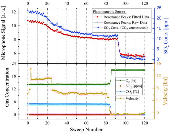 After successfully installing the newly developed and the commercial gas analysers in the exhaust gas system and connecting them to the funnel, both sensor systems began acquiring the data of the test vessel. In Figure 10, the upper graph—the photoacoustic microphone signal of the developed SO2 sensor with the corresponding SO2 concentration; and lower graph—the measured gas concentrations measured by the IMR 7500; compare the measurements of the developed photoacoustic SO2 sensor to the measured values of the reference gas analyser [30]. All measured data in Figure 10 are plotted against the respective sweep number. The gas monitors were set to complete 120 sweeps per day [30]. The black curve in the upper graph in Figure 10 corresponds to the manually analysed raw data values of the measured peak maximum of every sweep, while the red curve complies with the values of the internal system analysis electronics [30]. Both curves are clearly matching, showing that the previously assumed fit function reliably represents the measured raw data. The dark blue curve in the upper graph represents the measured SO2 concentration in ppm after compensating the effect of CO2 on the detected signal.