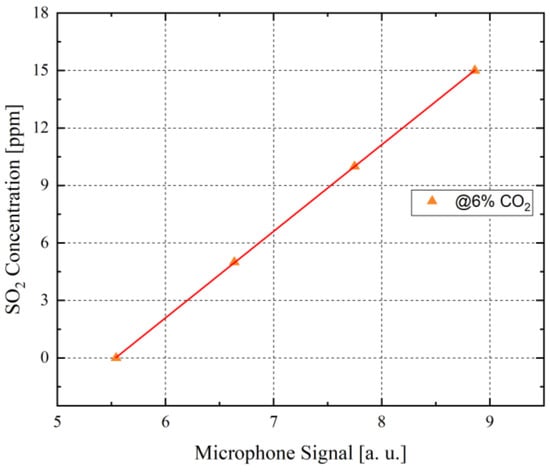 To translate the measured raw microphone signal values into a ppm concentration of the detected SO2, the values of the microphone signal are cross-referenced to a calibration curve, which was generated in laboratory conditions using pre-calibrated MFCs (Figure 11). Due to the significant influence of CO2 on the detected SO2 concentration in the ship funnel, the SO2 concentration calibration curve was generated at 6 vol.-% CO2, which corresponds with the detected CO2 concentration in the measured gas mixture within the funnel. Owing to the linearity of the calibration curve (Figure 11), the SO2 concentration in ppm can be estimated via the detected microphone signal. The determined ppm concentrations of the measured SO2 showed that the detected SO2 concentrations varied between 0 and 23 ppm, as can be seen in Figure 10. At the beginning of the measurements, the emitted SO2 concentration is at about 23 ppm, after which the container ship lowers its velocity and whereupon the measured SO2 concentration falls to about 11 ppm. At approximately sweep number 90 (Figure 10), the emitted SO2 concentration value falls to about 0 ppm, which represents the complete standstill of the container ship after reaching parking position at the targeted harbour. All presented SO2 concentration values are in accordance with the expected SO2 concentration range between 22 and 36 ppm SO2 that container ships which use low sulphur fuel must emit by law.
