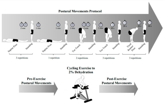 Scripted postural movements. Overall, 11 postural movements were performed before and after exercise (2% dehydration) during the dehydrated sessions with a varying number of repetitions. For the hydrated sessions, participants performed the postural movements following an equivalent amount of exercise needed to lose 2% bodyweight during the respective dehydrated sessions. The timing of the full postural movement sequence and the number of repetitions are shown in the top panel. The bottom panel shows the timing of the postural movements relative to the exercise component of the protocol. After transitioning to a standing position and completing a repetition, participants sat for 1 min.