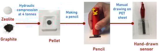 The prepared pellet (a.k.a. ISP lead) was inserted into a pencil clutch prepared using a 3D printer (PLA filament, Wanhao Duplicatior 4S) to obtain Ion-Sensing Pencil (ISP). Obtained ISP was used to hand-draw a line onto the PET sheet etched with the aluminium oxide (grit 240) for 30 s to provide a rough surface with enhanced porosity and improved adhesion of ISP lead. The sensor was obtained by abrasion until the resistance of the drawn line was lower than 3.0 kΩ, as suggested previously [44]. The overall scheme of the sensor preparation is given in Figure 1. In total, twelve zeolites were used (Table 1), and each sensor contained only one type of zeolite. Further on, these sensors are encoded as s1–s12, correspondingly.