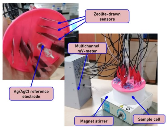 The visual appearance of the measuring set-up is given in Figure 2. The measurements were carried out using multichannel mV-meter KHAN-10 (Sensor Systems LLC, St. Petersburg, Russia) connected to a PC for data acquisition and processing. The electromotive force (EMF) was measured with 0.1 mV precision against the standard reference silver/silver chloride electrode (Izmeritelnaya Tekhnika, Moscow, Russia).