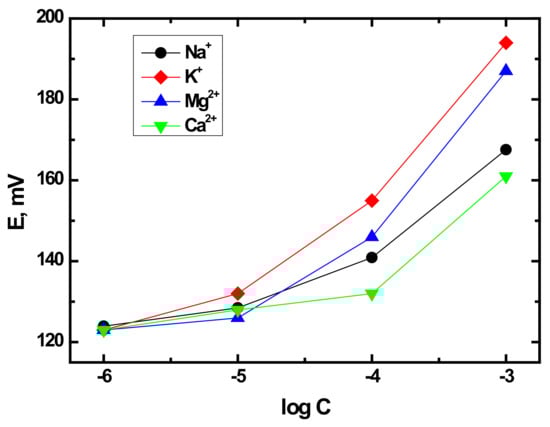Initial characterization of ISPs revealed that their response behavior is analogous to classical ion selective electrodes (ISEs) [33]. This is not surprising given that ion exchange is the key response mechanism. Therefore, near-Nernstian responses of individual sensors is expected while using potentiometry as the analytical technique. Herein, initial assessment of the zeolite-based sensors was performed in the individual aqueous solutions of alkali and alkali-earth metals. As a typical example of the potentiometric response, Figure 3 shows the calibration curves obtained for NaX zeolite sensor in Na+, K+, Mg2+, and Ca2+ solutions, demonstrating that the sensor response varies between different cations. The values of sensor sensitivity calculated between 10−5 and 10−3 M for all studied sensors are reported in Table 2. Specific details of the experimental protocols and discussion of these results are available in Reference [33]. Briefly, sensors exhibit various degrees of agreement with near-Nernstian slopes, which is not surprising given that selectivity of zeolites is inferior to classical ISEs that rely on strong covalent interaction of the target analyte to a very selective ionophore. The origin of zeolites’ selectivity is more complex and relies on factors, such as zeolite channel structure, pore size, and Si/Al ratio in the zeolite structure [42]. However, most studies have been typically focused on the application of zeolites in catalysis. In fact, to the best of our knowledge, there is no available study of the influence of these factors on sensing purposes. This is a topic of research currently performed in our group to be reported in a forthcoming publication.