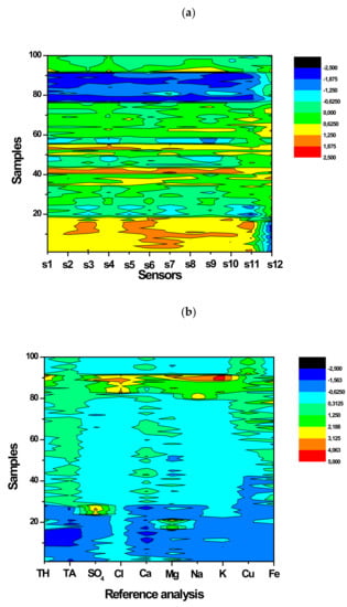 Twelve “pencil-drawn” sensors were organized into a sensor array and the measurements were performed in real surface waters sampled from the rivers. The same samples were characterized using standard analytical techniques to assess chemical parameters of the water quality. The purpose was to investigate if it is possible to relate the response of such sensor array with certain water quality parameters. Figure 4 shows the heatmaps of the autoscaled potentiometric sensor responses (Figure 4a) and the autoscaled analyte concentration data from the reference methods (Figure 4b). Sensor encoding (s1–s12) corresponds to Table 2. Examples of potentiometric response and reference data are provided in the Supplemental Info (Tables S1 and S2). As autoscaling returns dimensionless units, the color map has the same dimensionless nature, and the absolute values of the resulted sensor response and reference data are encoded with color.